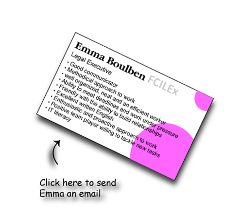Name: Emma-Louise Boulben Address: 17 High Street, Hinxton, Saffron Walden Telephone number: 01799 531107 Mobile number: 07759 264973 Website and contact Email: http://www.locumconveyancer.com Date of Birth: 13.04.72 Nationality: British Languages: English, French, Spanish |